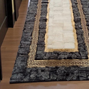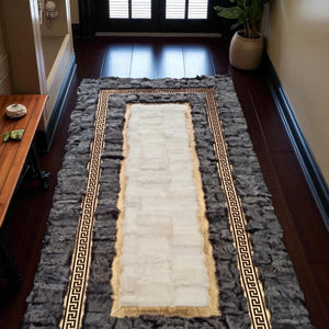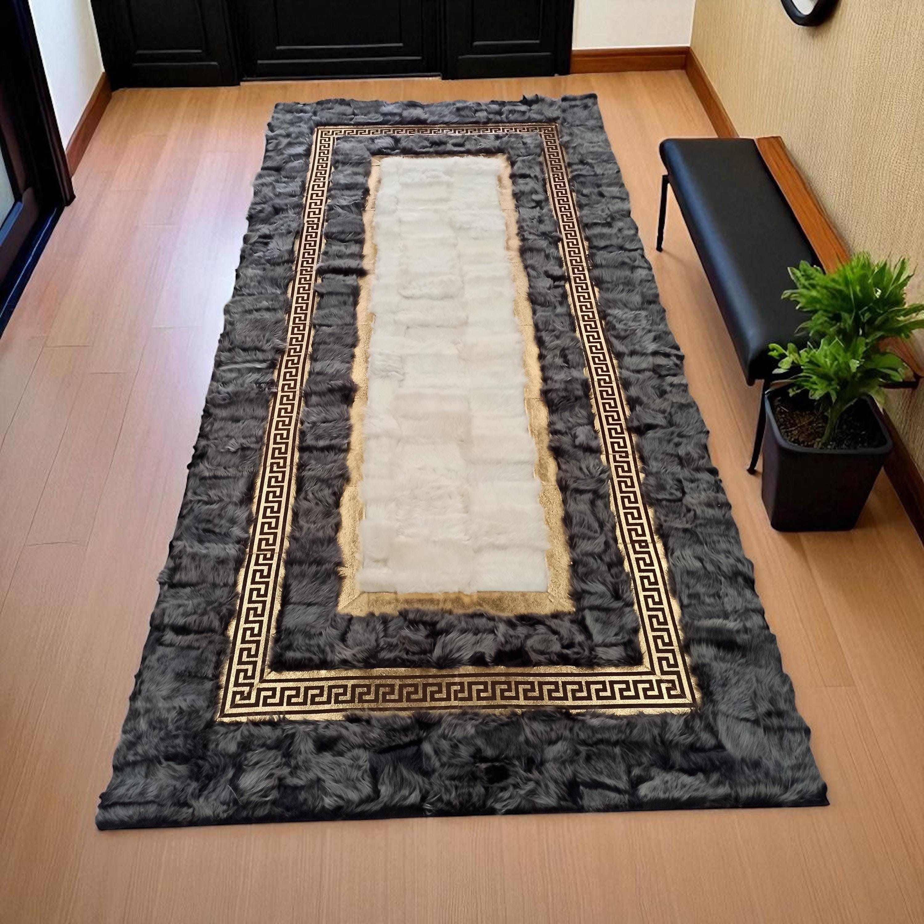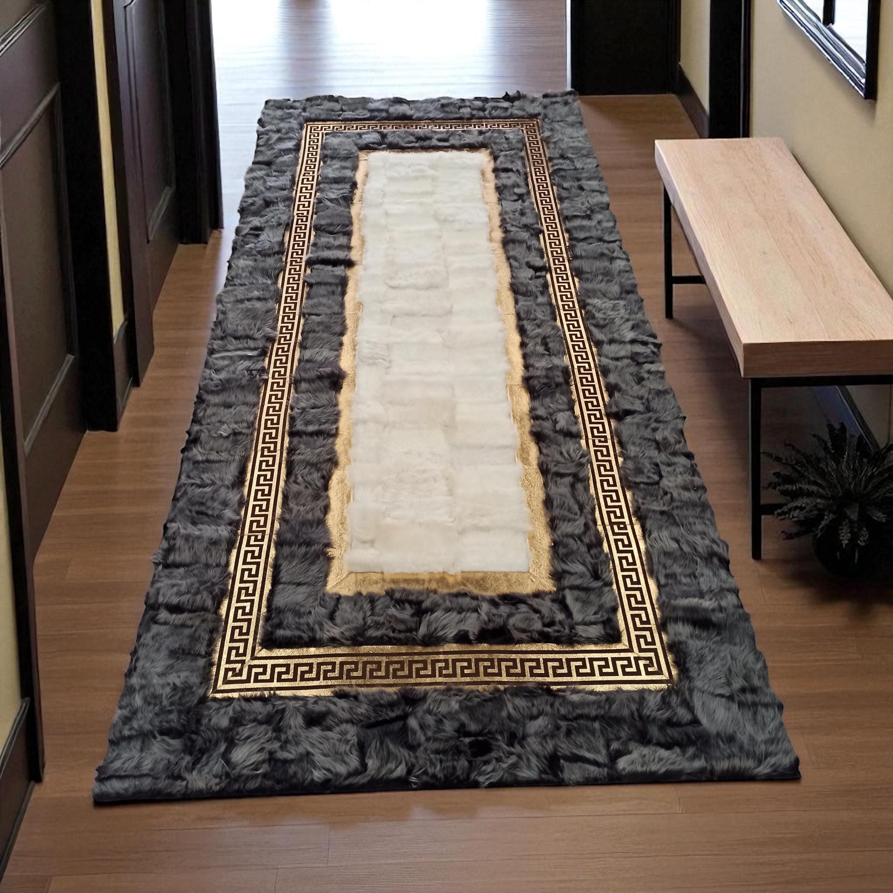Gray Gold Tuscan Runner Rug, Long Handmade Fur Carpet with Greek Key Border, Custom Size Luxury Entryway Rug, Soft Natural Fur Runner