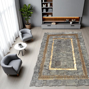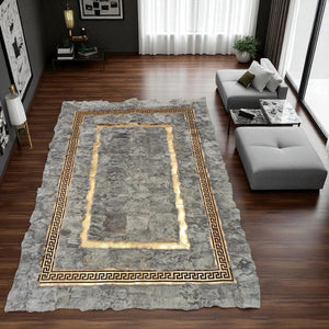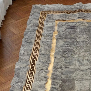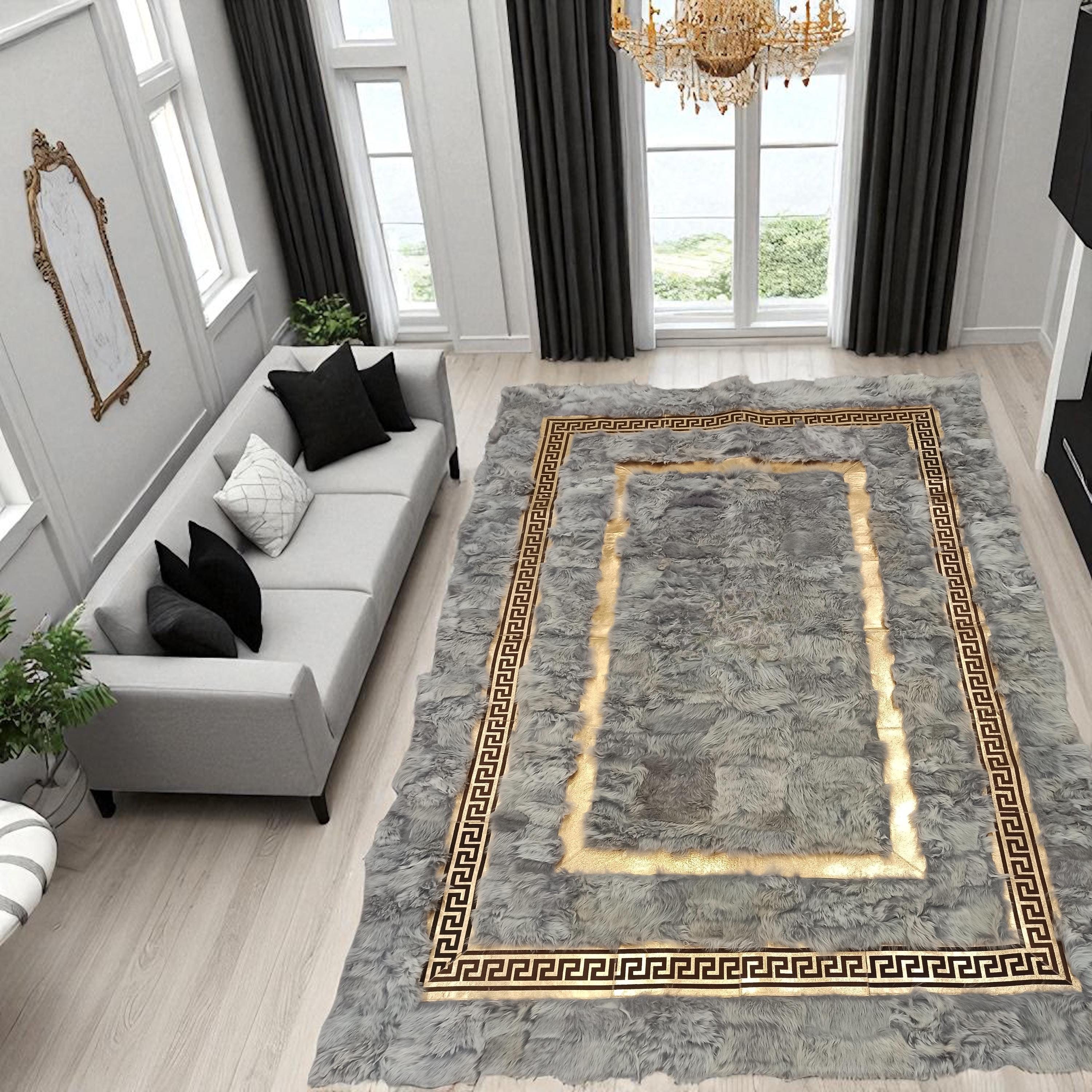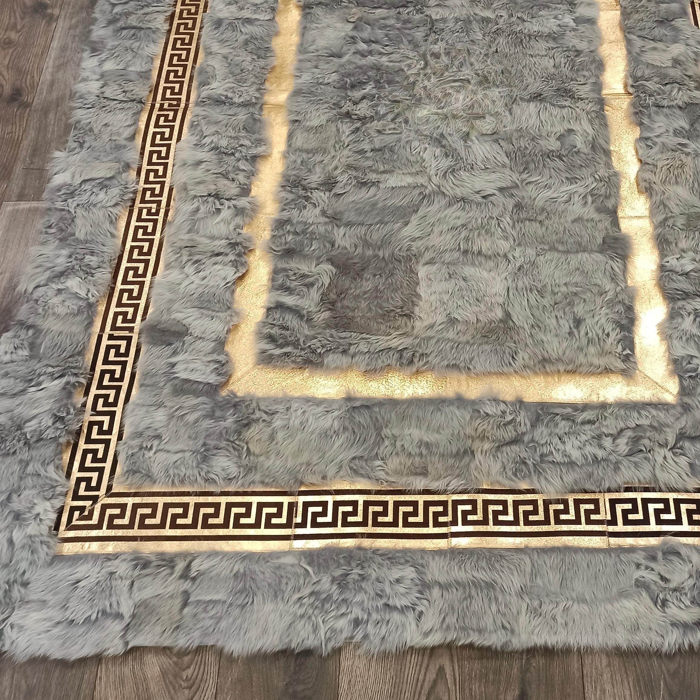 This rectangular Tuscan rug is crafted from high-quality soft fur and features a unique light gray tone paired with elegant gold Greek key borders. Designed to blend luxury and comfort, this handmade carpet is perfect for enhancing modern living rooms, bedrooms, or offices. Its eye-catching texture and durable structure make it both a functional and decorative choice. Custom sizes are available to suit your specific needs.