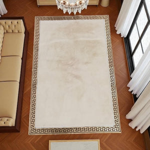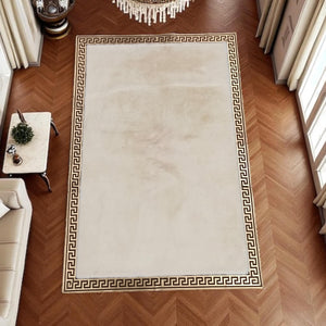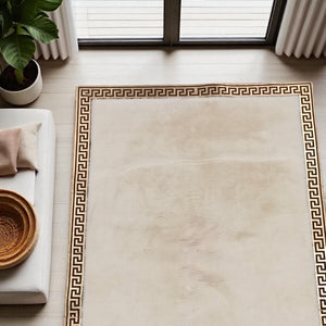 Bring timeless sophistication to your home with this Beige Plush Rug with Gold Greek Border. Crafted from high-quality plush fabric, this rug features a soft beige surface framed by an elegant gold Greek key border. Its velvety texture and classic design make it a versatile piece that enhances both modern and traditional interiors with a warm, luxurious feel.
