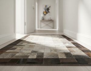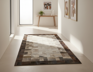 This grey-brown patchwork cowhide rug brings a sophisticated blend of texture, warmth, and natural beauty to your home. Handcrafted from genuine hair-on-hide leather, each panel is carefully selected and arranged to create a rich, dimensional pattern framed by a darker cowhide border. The result is a timeless piece with soft neutral tones that complement both modern and classic interiors.