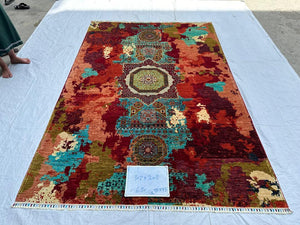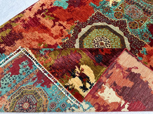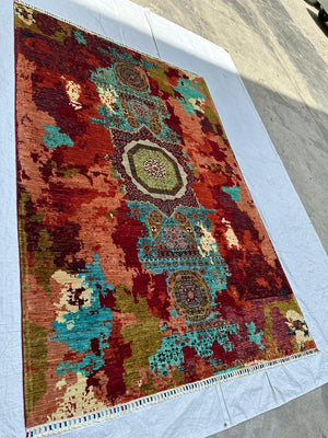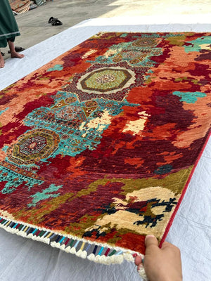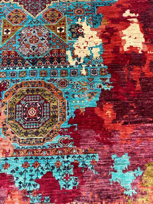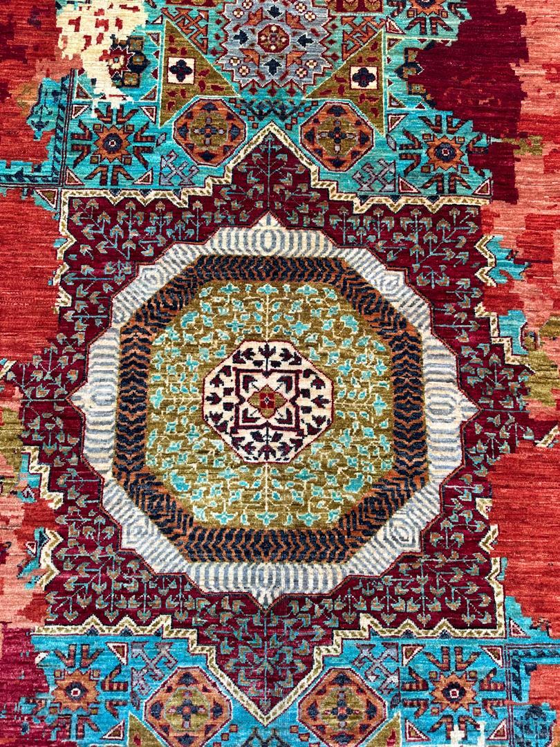 This exquisite Afghan Memluk rug is hand-knotted with 45/45 knot quality, combining precision craftsmanship with a striking geometric design. The bold red background is contrasted with turquoise and earthy tones, creating a visually dynamic piece. Woven with a wool pile on a cotton foundation with cotton fringes, this rug offers durability and elegance. Measuring 303x208 cm (10x6.8 ft), it is a statement piece suitable for large living spaces or as a collector’s item.
