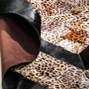This leopard print cowhide patchwork rug with a bold black border is a handmade genuine leather carpet that blends natural cowhide with modern design. Its striking animal-inspired patchwork pattern makes it a perfect centerpiece for living rooms, bedrooms, or entryways. With custom size options, it offers both durability and luxury.