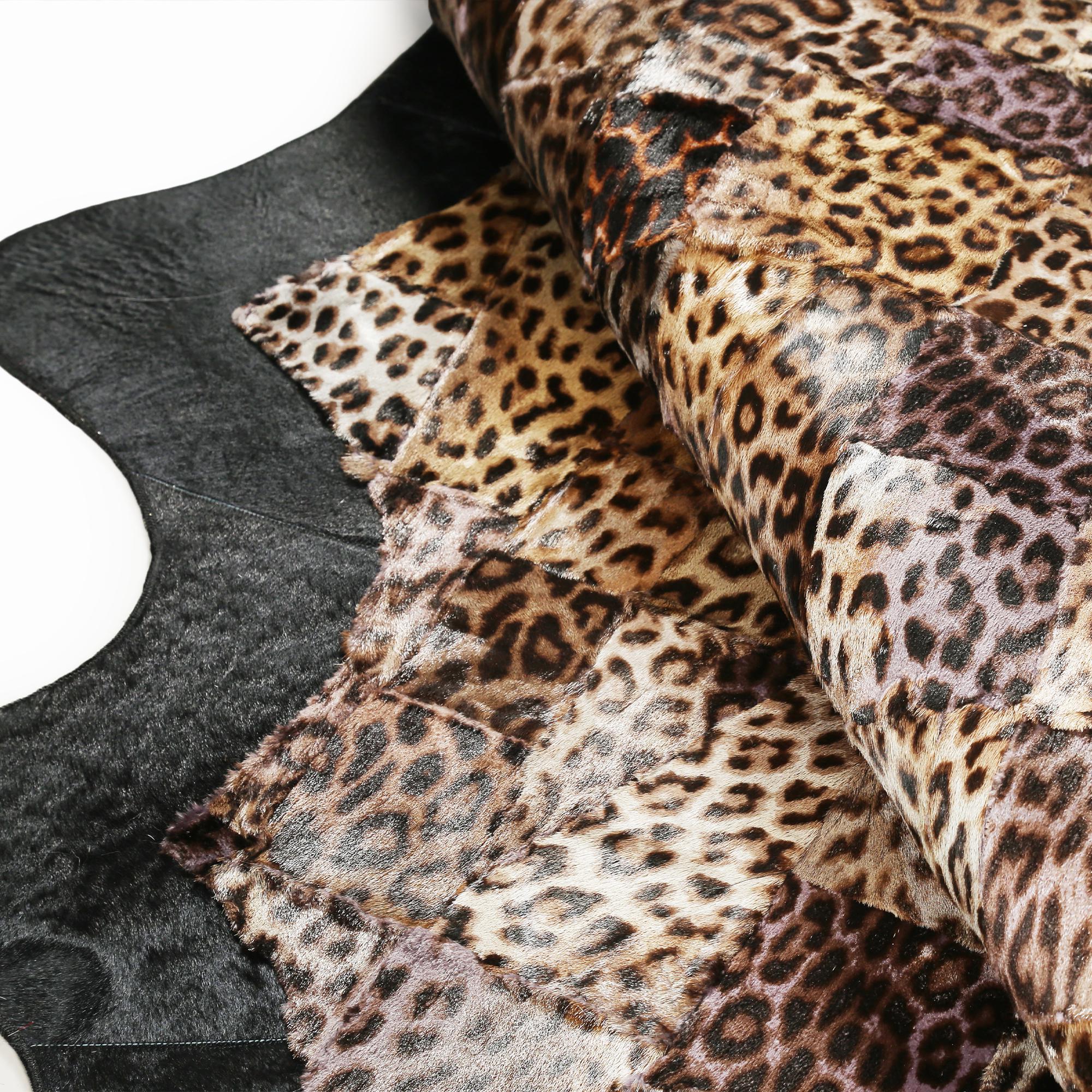 Add a bold and luxurious statement to your home with the Leopard Print Patchwork Peltry Rug. This genuine leather carpet features a striking leopard print pattern, accented with a sleek black border for a modern and elegant finish. Made from high-quality leather, this patchwork area rug blends sophistication with durability, perfect for your living room or any stylish interior. Elevate your space with this eye-catching design, offering both comfort and timeless appeal. It also makes an exceptional gift for those who appreciate high-end home décor.