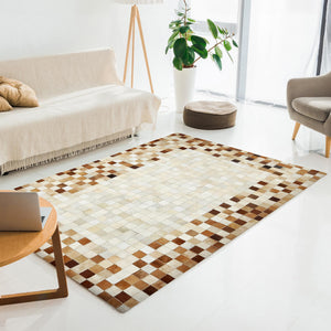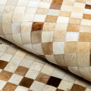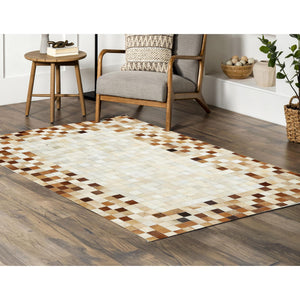 Light Brown Chekered Border & Beige Cowhide Patchwork Rug
