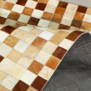Bring warmth and elegance to your home with this Light Brown & Beige Cowhide Patchwork Rug, crafted from genuine calfskin for unmatched quality and durability. The checkered design in soft brown and beige tones complements any living room, farmhouse, or country-style decor. Its natural texture and luxurious appeal make it both a practical and stylish addition to your home. Perfect as a gift for housewarming or as a statement piece to enhance your interior design.