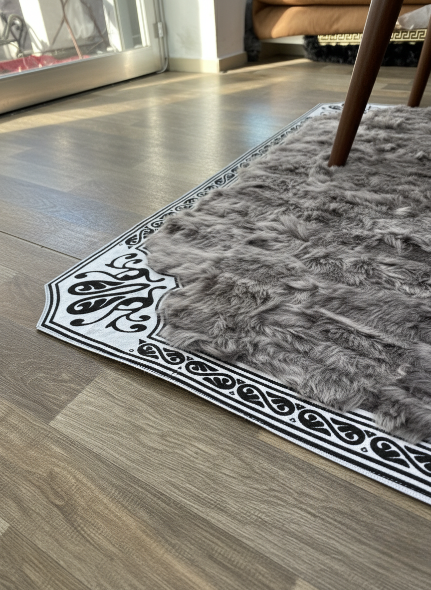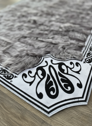 • Design: Textured gray fur surface with black-and-white ornamental corner detailing.