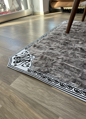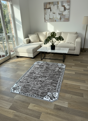 Gray Tuscan Area Rug – Black & White Corner Detailing, Natural Fur Texture, Non-Slip Backing, Custom Sizes Available