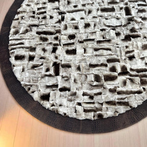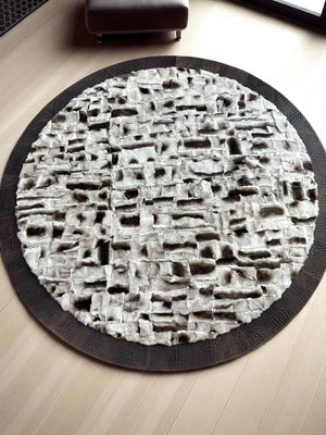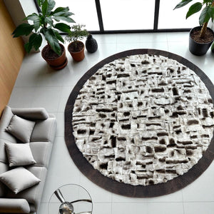 This Round Beige Tuscan Sheepskin Rug blends natural softness with distinctive craftsmanship. Made from 100% genuine Tuscan sheepskin, it features a sculpted patchwork texture framed by a deep brown border. The combination of light beige tones and dimensional surface adds both warmth and character to any living space.