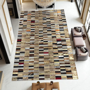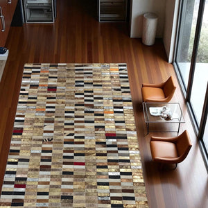 Gold and Beige Cowhide Patchwork Rug, Handmade Natural Leather Carpet