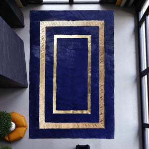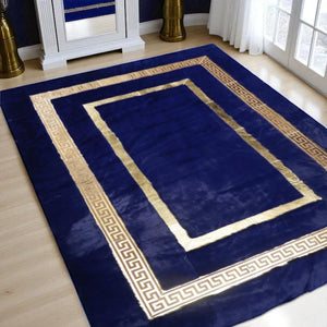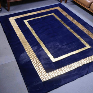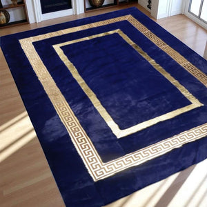 Add a bold statement to your interior with this elegant navy blue plush area rug featuring a luxurious gold Greek key border. Crafted from premium-quality faux fur, this rug offers not only a visually striking appearance but also a supremely soft and cozy texture underfoot. Its rich navy color contrasts beautifully with the shimmering gold accents, creating a refined and contemporary aesthetic that elevates any living room, bedroom, or office space.