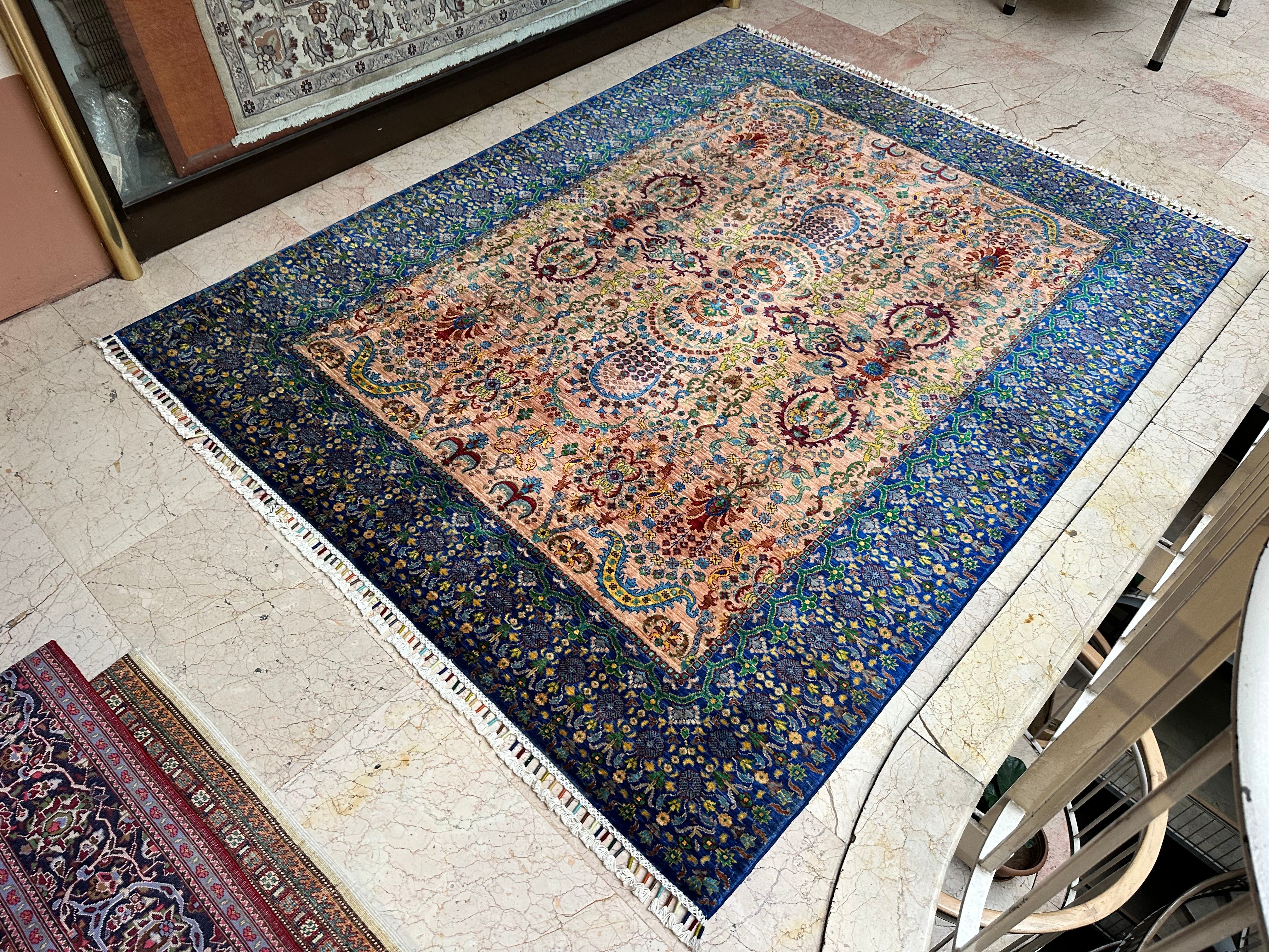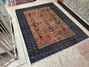 Oriental Floral Rug – Hand-Knotted Wool Carpet 234x183cm (7.7x6ft) with Navy Blue Border, One of a Kind Area Rug