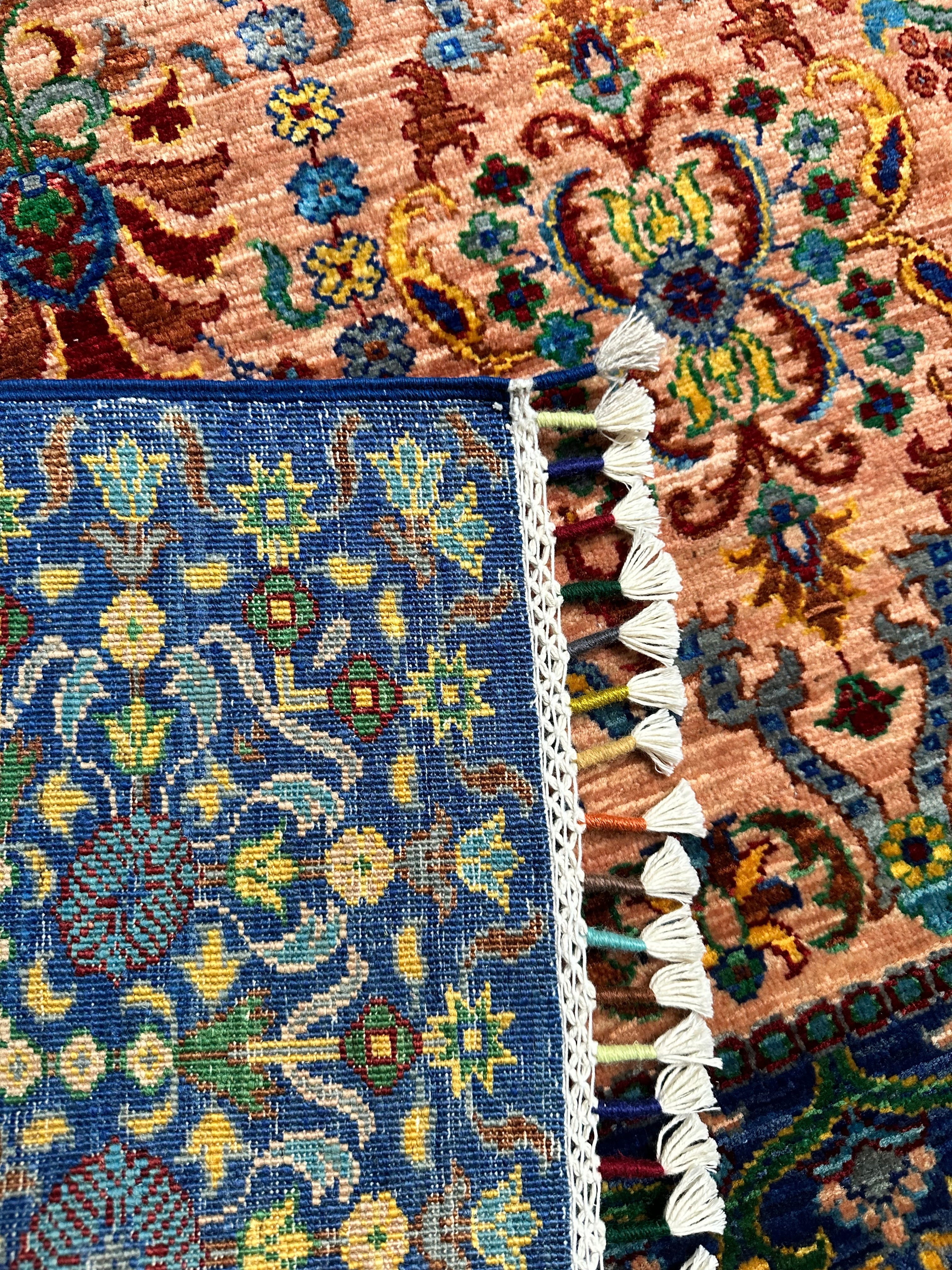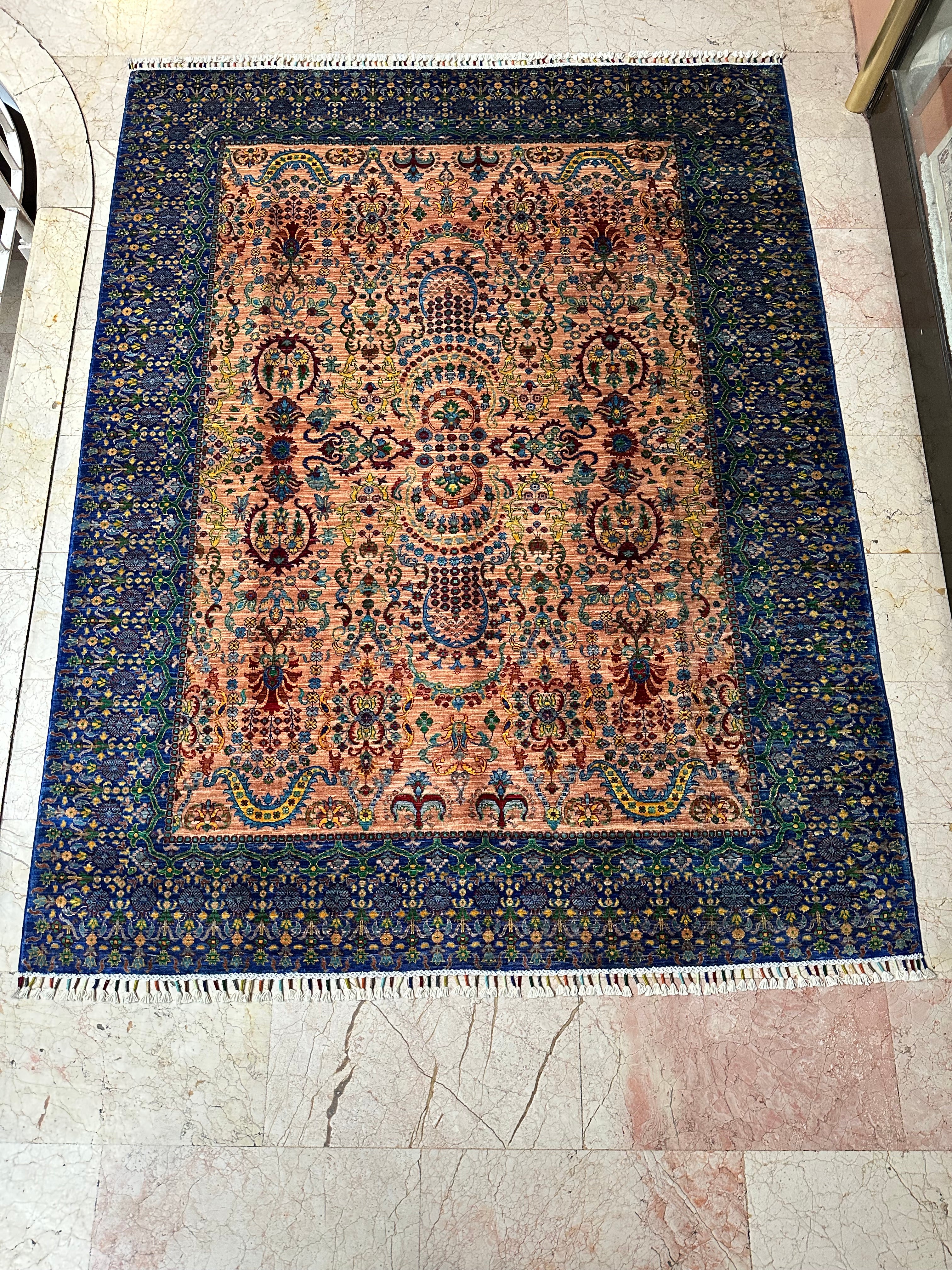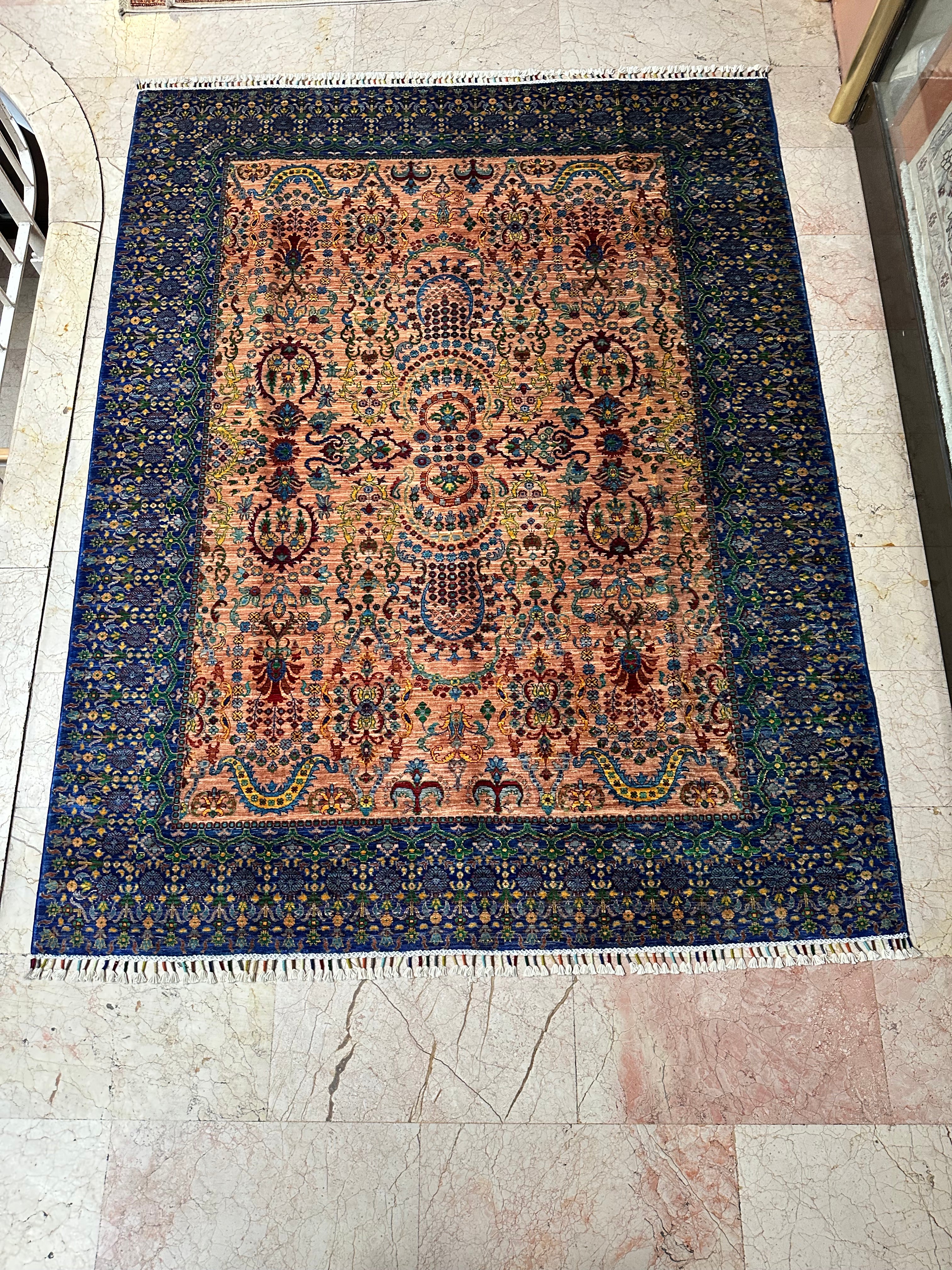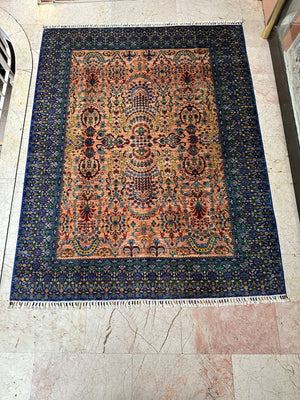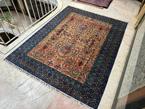 This hand-knotted Oriental floral rug features an intricate all-over design on a warm peach field, framed with a deep navy blue border rich in floral motifs. Crafted with a wool pile on a cotton foundation (50/50 knot quality) and finished with cotton fringes, this rug offers both durability and elegance. Measuring 234x183 cm (7.7x6 ft), it is a perfect statement piece for living rooms, dining spaces, or offices.