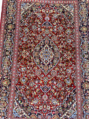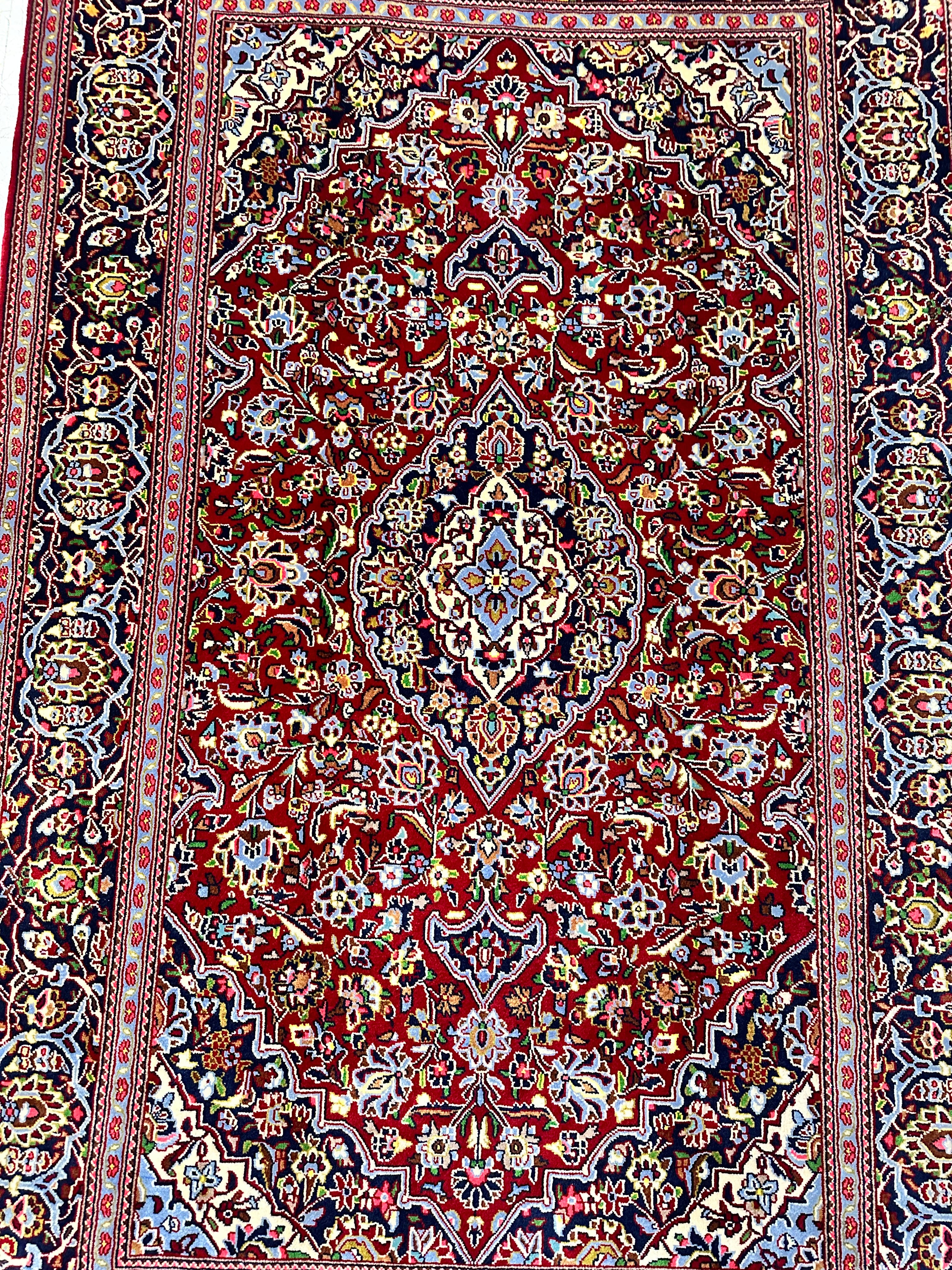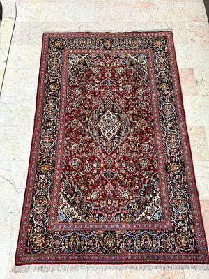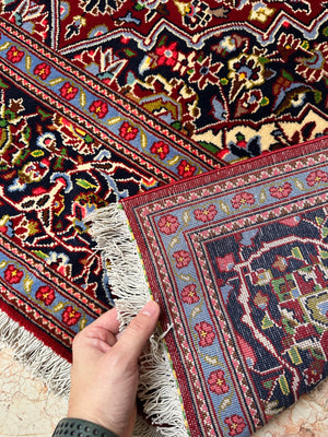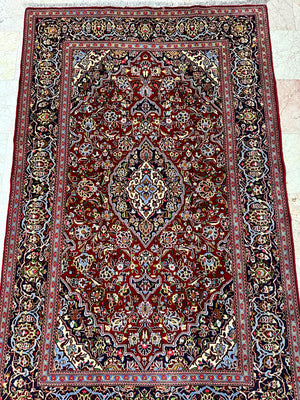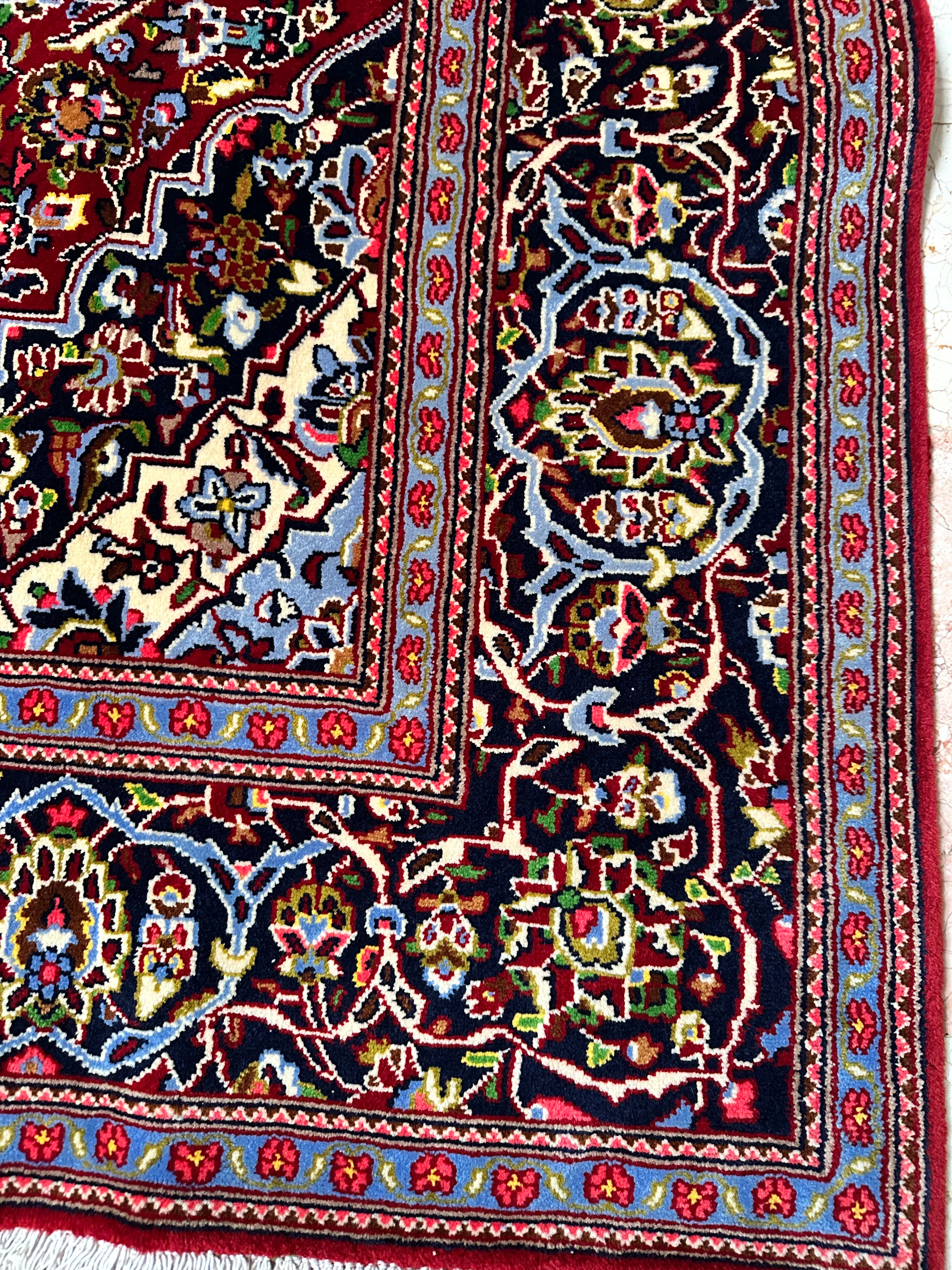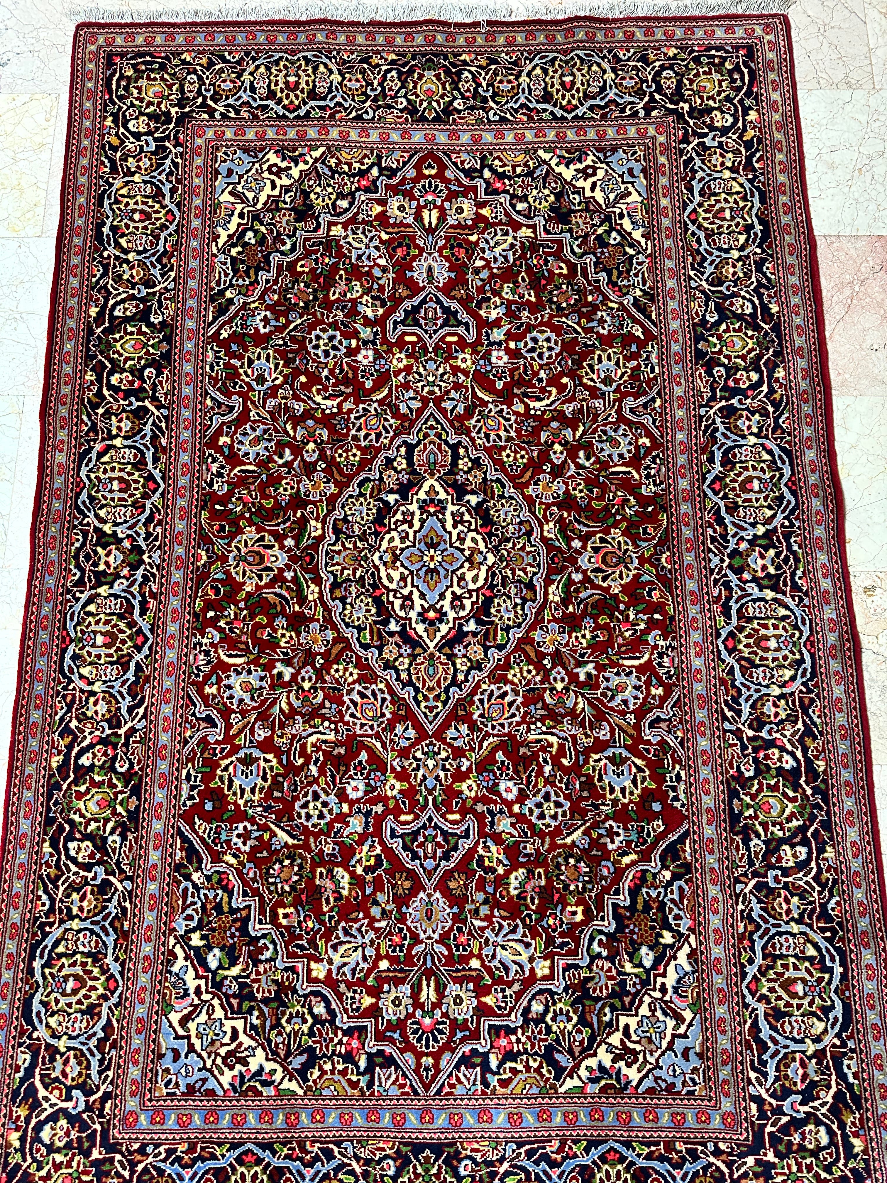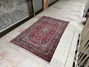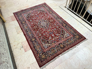 This hand-knotted rug features a classic central medallion design on a deep red field, surrounded by elegant floral borders. Woven with a wool pile on a cotton foundation, it combines durability with timeless craftsmanship. Measuring 205x132 cm (6.7x4.3 ft), this rug brings authentic elegance to living rooms, dining areas, or offices.