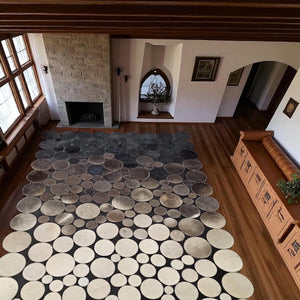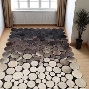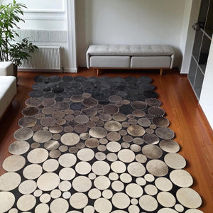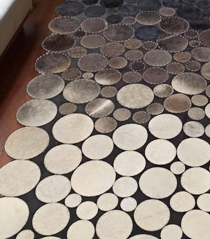 This handcrafted cowhide rug is designed with a unique polkadot layout, blending various shades of black, gray, and taupe in circular patches. Each circle is individually selected and stitched with precision, resulting in a modern and textured composition that adds character and depth to any room. Durable and stylish, it combines natural leather strength with contemporary aesthetics, making it ideal for living rooms or offices.