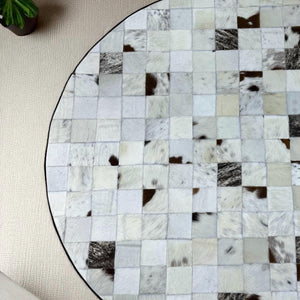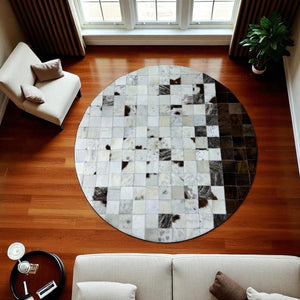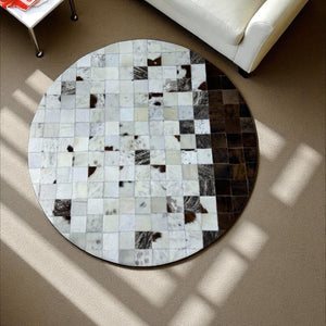 White Round Patchwork Cowhide Rug, Handmade Living Room Leather Carpet