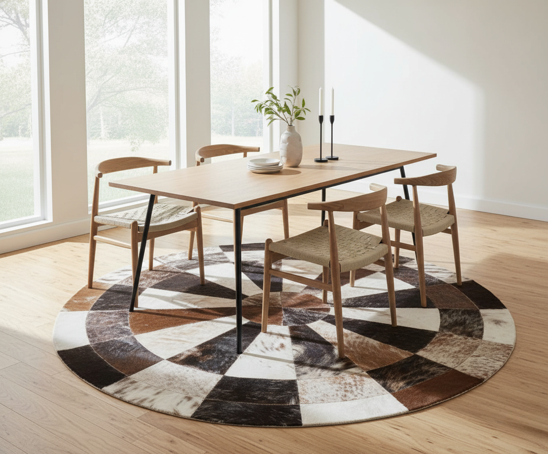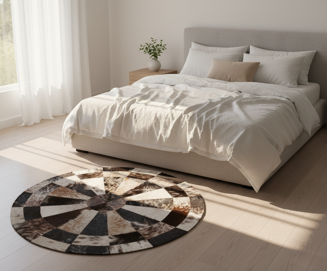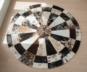 This stunning round patchwork cowhide rug brings movement, depth, and artisan beauty into your home. Carefully handcrafted from genuine hair-on-hide leather, each panel is selected for its natural color variation, creating a radiant circular pattern that feels both modern and timeless. The blend of brown, black, and white tones adds warmth and richness, while the smooth hide texture introduces a luxurious element to any room.