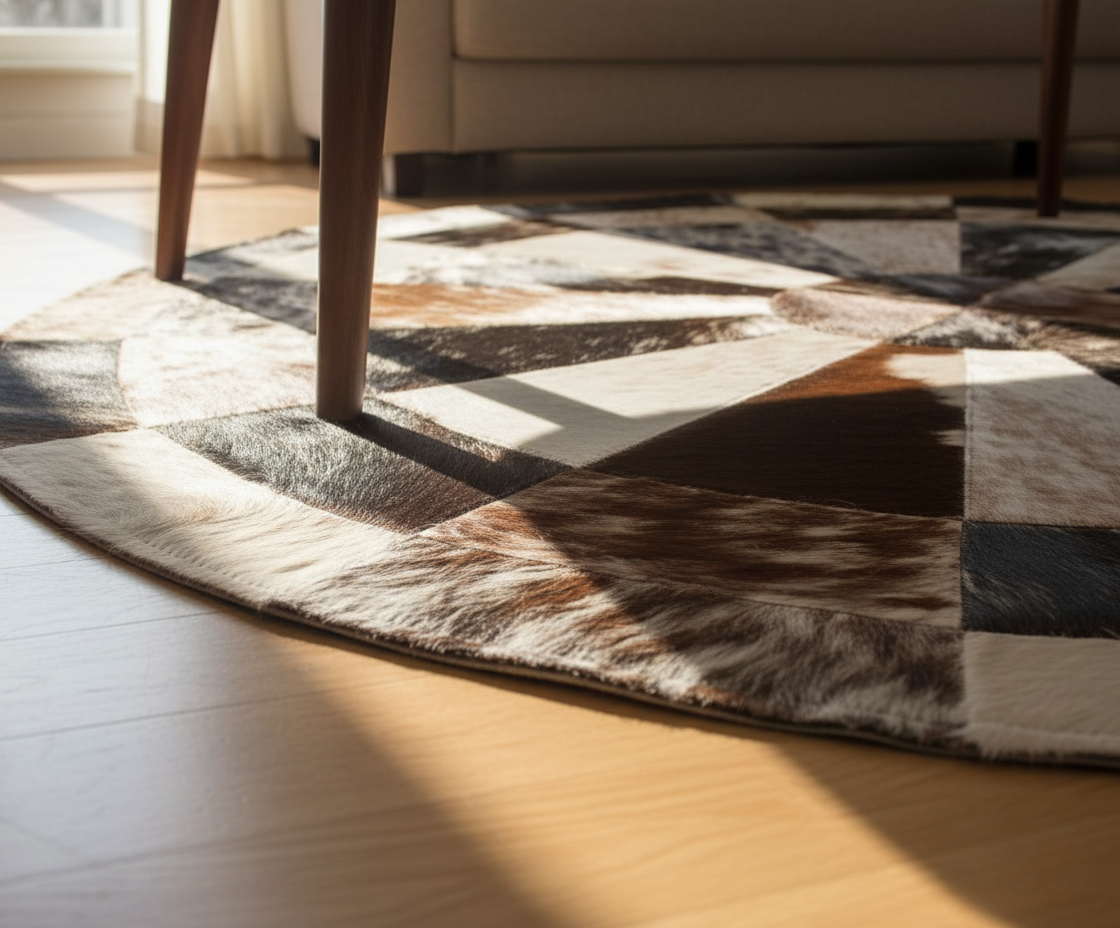 Round Patchwork Cowhide Rug – Circle Leather Rug, Handmade Natural Cowhide Carpet for Home Décor