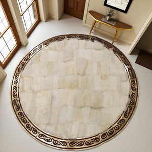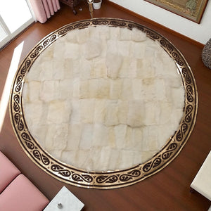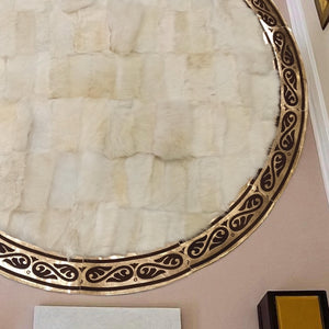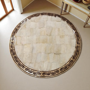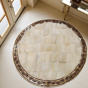 Crafted from high-quality Tuscan sheepskin, this round rug offers a natural softness and warmth that transforms any space instantly. The cream-toned surface is delicately assembled from fur panels, while the metallic gold patterned border adds a luxurious decorative element.