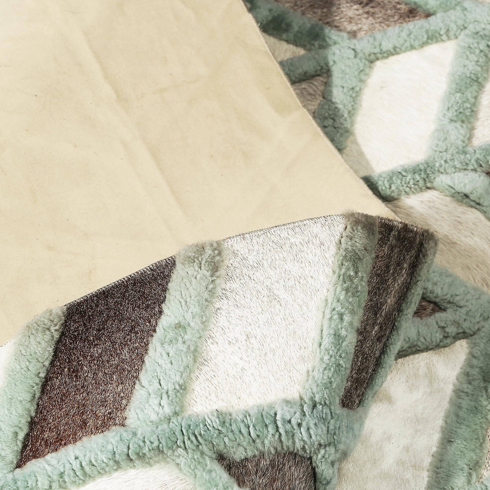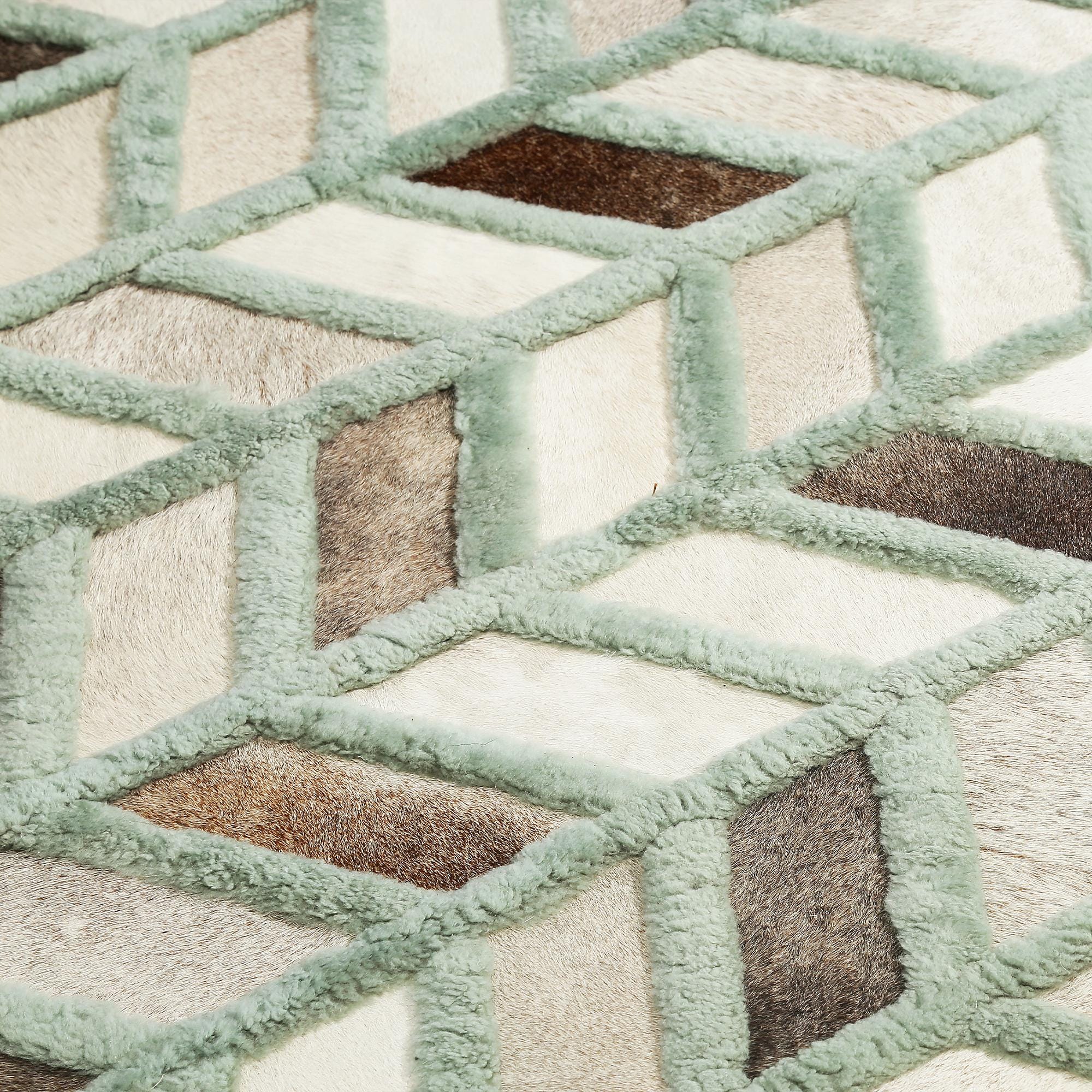 Green and Gray Geometric Cowhide Patchwork Rug, Handmade Genuine Leather Area Carpet, Modern Natural Cowhide Rug for Living Room