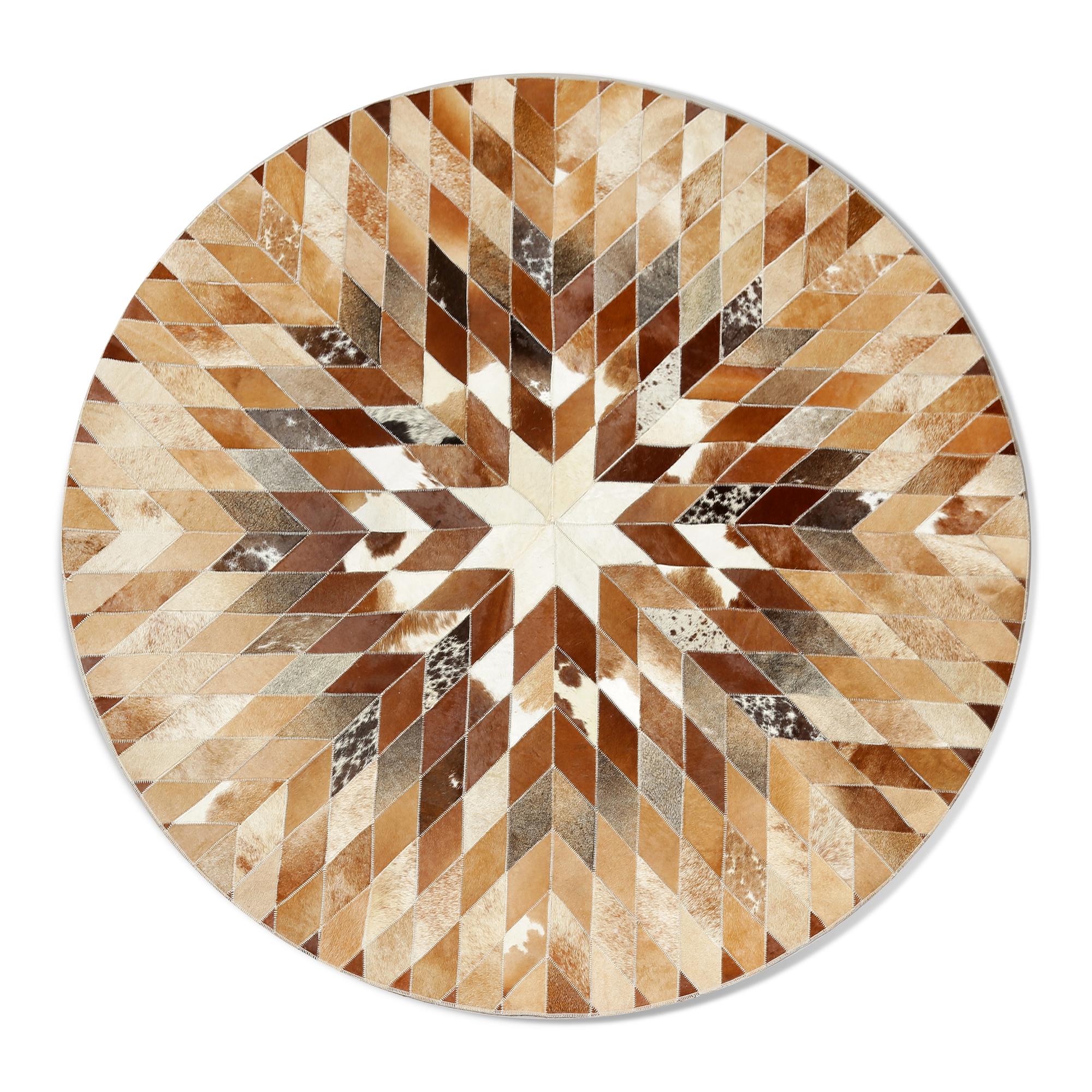 Round Star Cowhide Rug – Brown White Patchwork Leather Circle Carpet, Handmade Genuine Cowhide Rug for Living Room & Rustic Decor