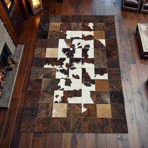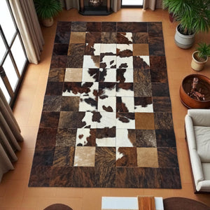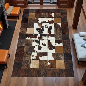 Brown and White Cowhide Patchwork Rug, Handmade Natural Leather Carpet