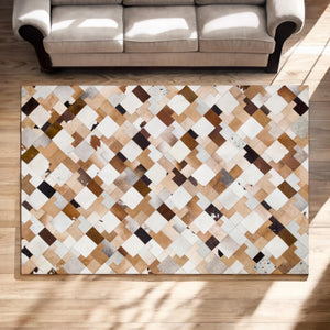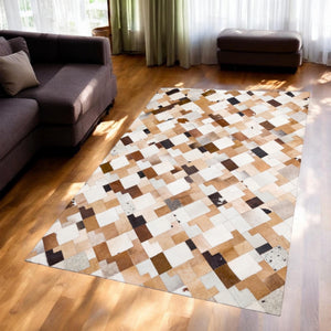 Enhance your home with this Tricolor Patchwork Cowhide Rug, a genuine calfskin rug that combines modern geometric design with rustic charm. The natural blend of brown, black, and white tones makes it a versatile addition to living rooms, offices, bedrooms, and farmhouse interiors.