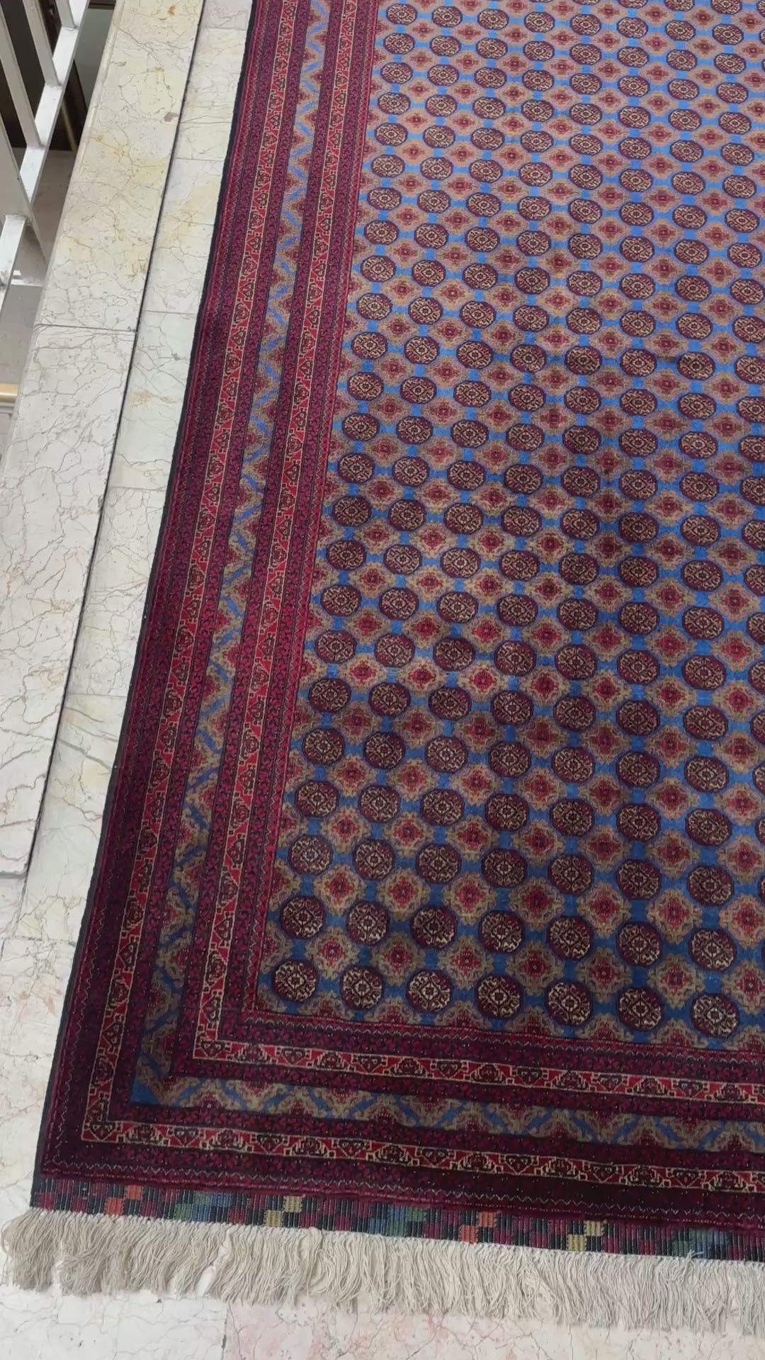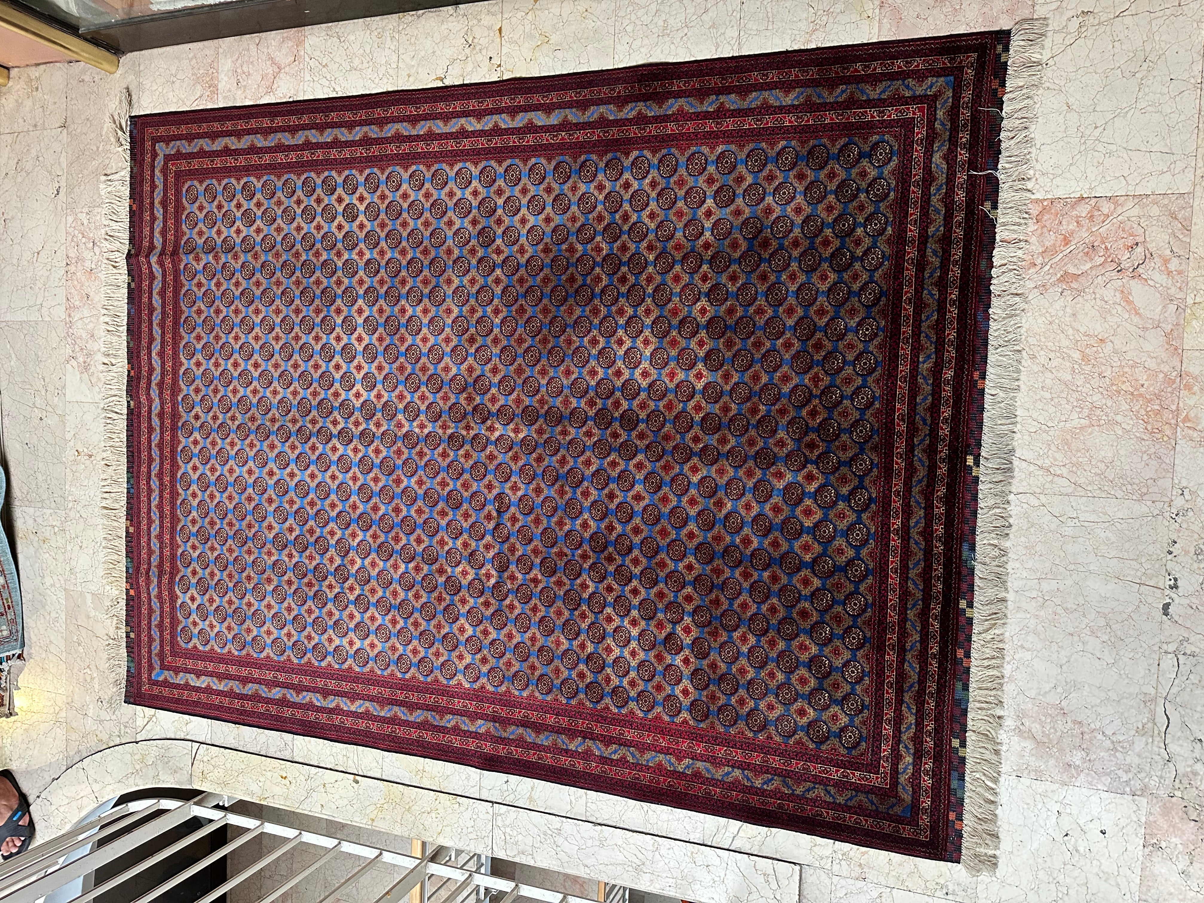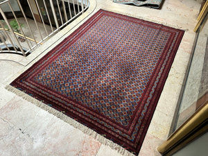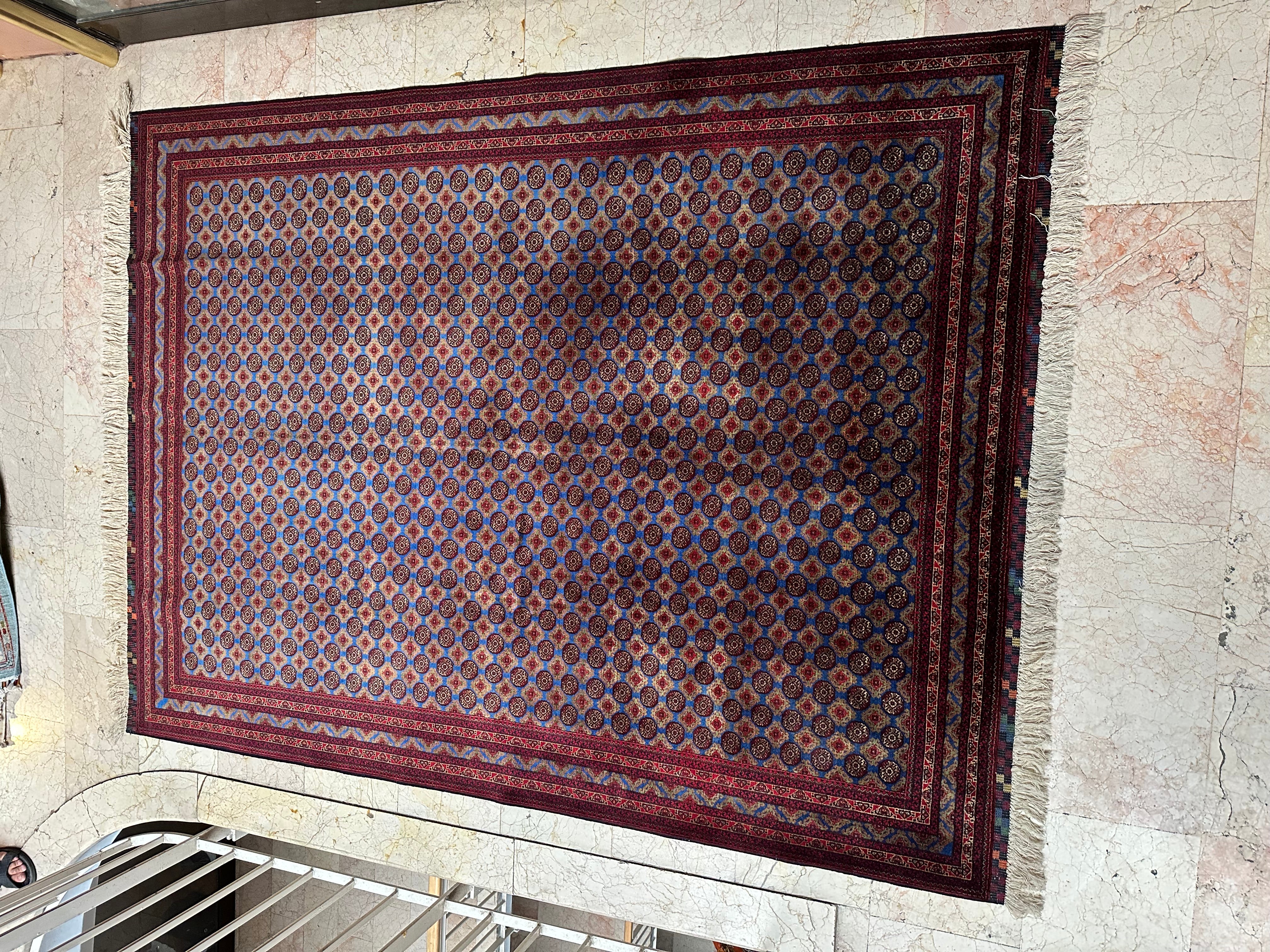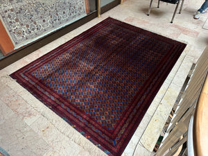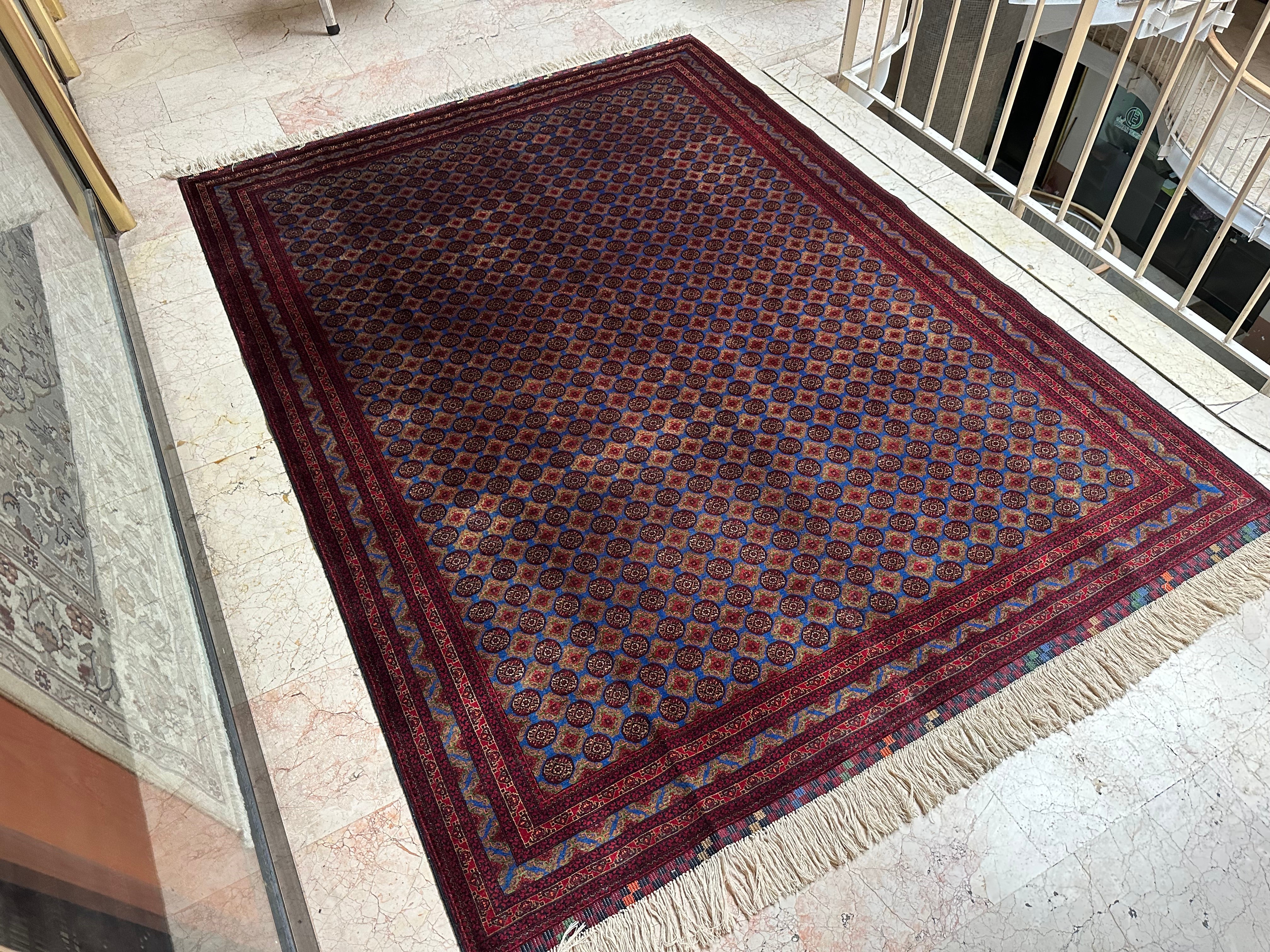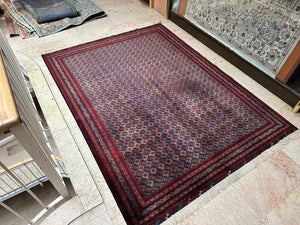 This hand-knotted rug showcases a repeating geometric pattern in deep red and blue tones. Crafted entirely from wool (pile, foundation, and fringes), it offers warmth, durability, and traditional craftsmanship at the highest knot density of 70/70 quality. Measuring 235x177 cm (7.7x5.8 ft), this rug is a bold and timeless choice for living rooms, dining areas, or offices.