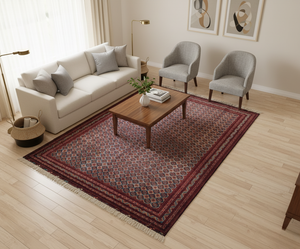 Add warmth and timeless charm to your home with this Hand-Knotted Wool Oriental Rug. Woven from 100% natural wool, it features an intricate repeating pattern in shades of red, navy, and beige, framed by bold geometric borders. Its balanced design and fine craftsmanship make it a versatile addition to both traditional and contemporary interiors.