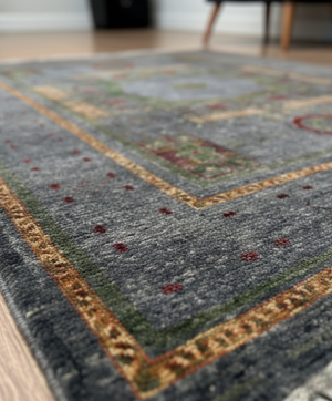 Bring subtle sophistication to your home with this Hand-Knotted Wool Gray Oriental Rug. Crafted from 100% natural wool, it features a soft gray base accentuated by geometric and floral motifs in warm red, gold, and green tones. The detailed borders and balanced color palette make it a timeless addition to both contemporary and traditional interiors.