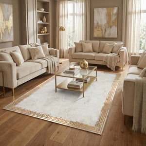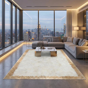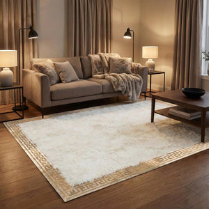 White and Gold Tuscan Rug, Geometric Border Area Rug, White Tuscan Fur Rug