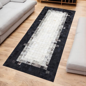 Enhance your living space with this White & Grey Cowhide Rug with Black Border, a stunning patchwork cowhide area carpet designed for luxury and durability. Handcrafted from 100% real calfskin leather, this high-quality cowhide rug features a modern white and grey gradient design, accentuated by a bold black border for a sophisticated touch.
