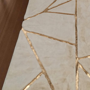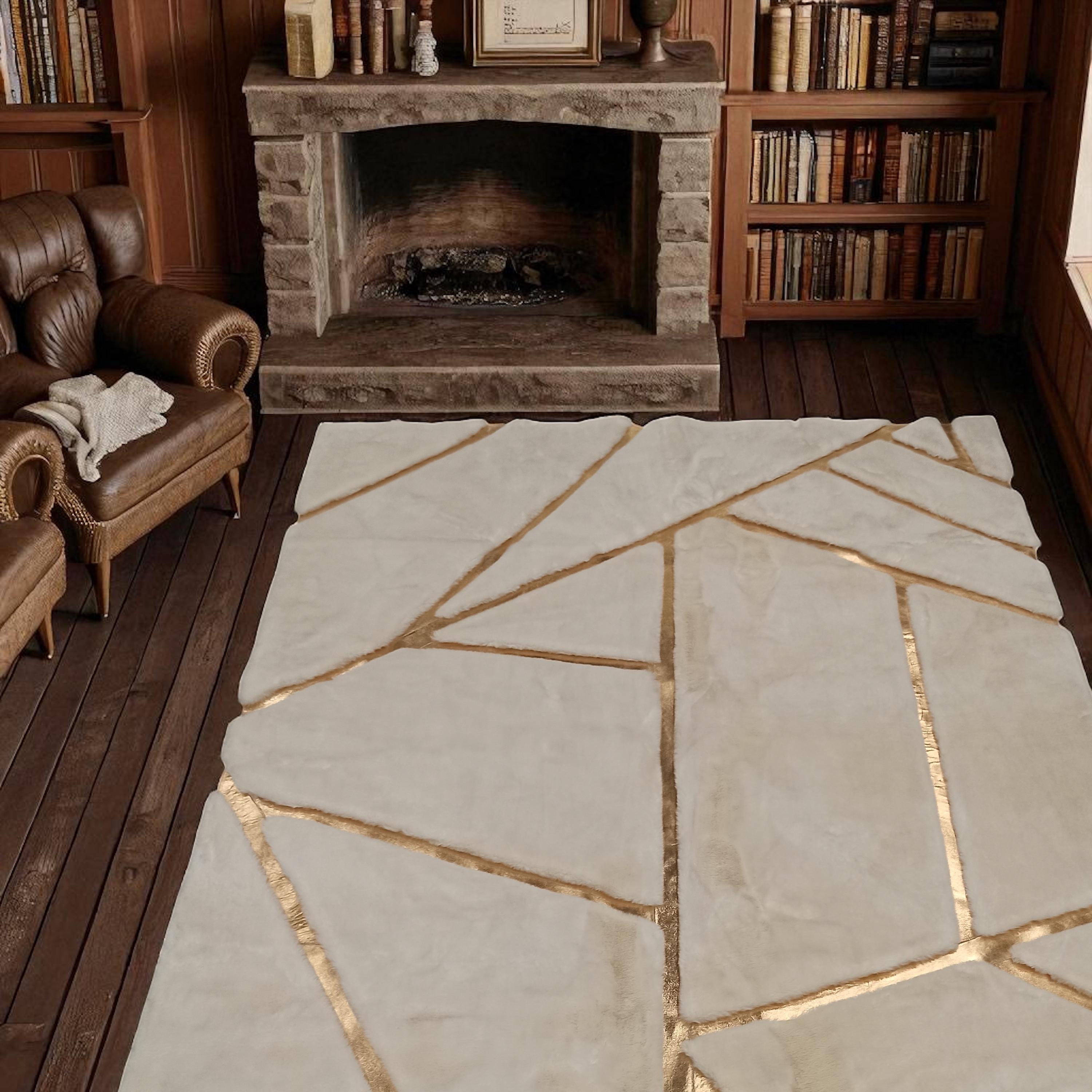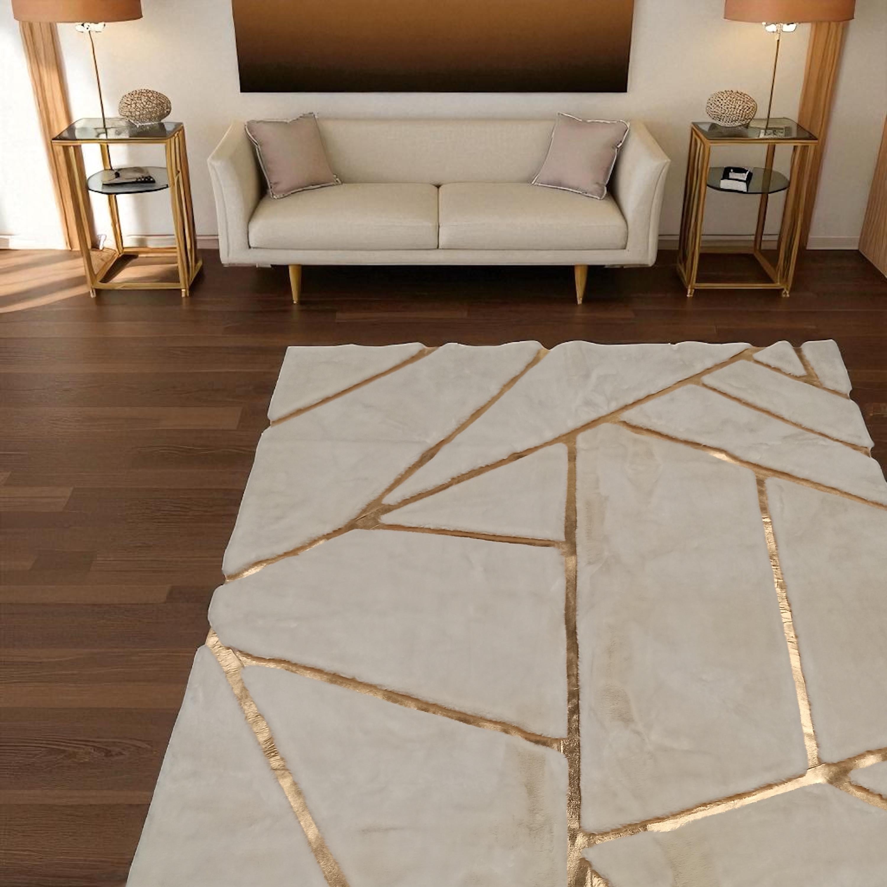 This elegant white plush rug is adorned with striking gold geometric lines, offering a luxurious and modern aesthetic. Its soft, high-pile faux fur surface provides unmatched comfort, perfect for elevating the warmth and style of any living room, bedroom, or lounge. Handcrafted with care and made from eco-conscious materials, this rug adds a contemporary statement while maintaining practicality. Available in custom sizes, itβs the ideal choice for those seeking both visual impact and everyday softness.