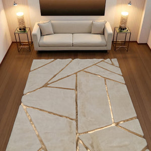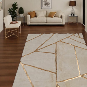 White Plush Rug with Gold Lines, Shaggy Living Room Carpet