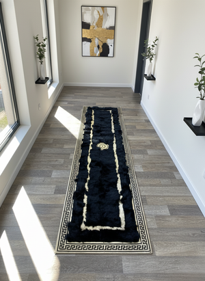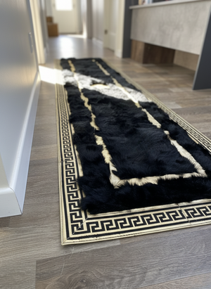Black Tuscan Runner Rug – Gold Line Accents, Natural Fur Texture, Non-Slip Backing, Custom Sizes Available