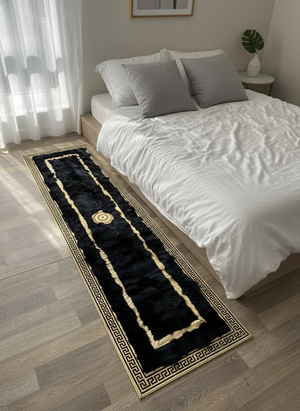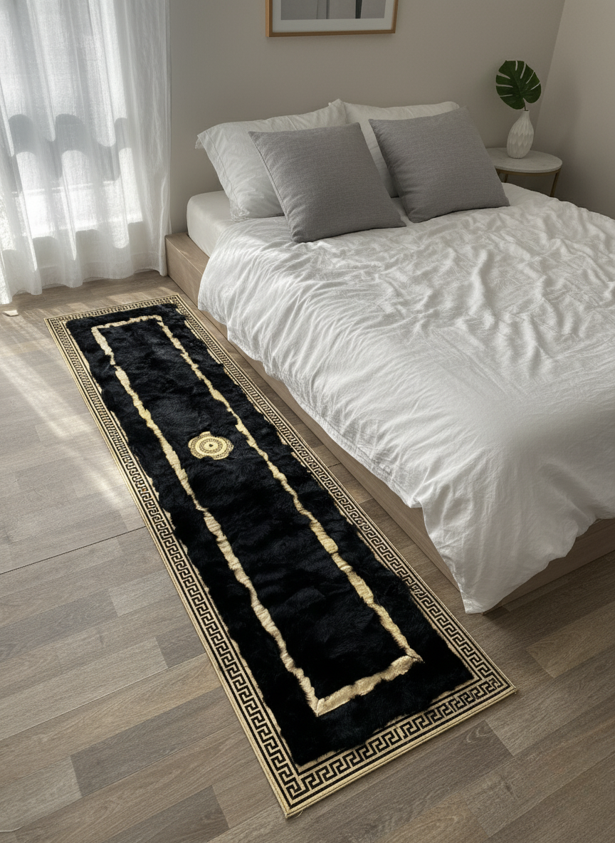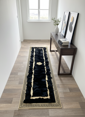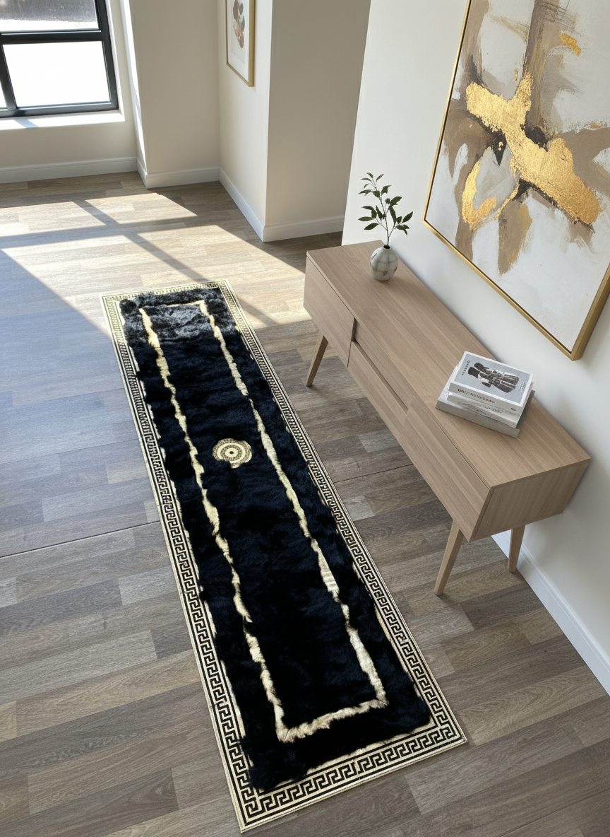 Enhance your home with this Black Tuscan Runner Rug, designed with a dense natural fur texture and luxurious gold line detailing. The deep black surface brings richness and sophistication to long hallways and entryways, while the gold linear accents and central medallion add a refined, elegant touch. Its elongated shape makes it an ideal statement piece for transitional spaces in both modern and classic interiors.